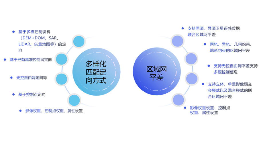 支持基于已有地理信息数据(DEM+DOM)自动定向;基于已有基准控制网定向;基于控制点定向;无控自由网定向等