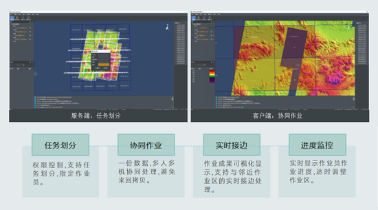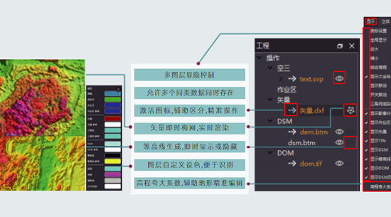 • ▷ 客户端作业。使用多图层功能按需添加数据,可同时添加地形、正射影像、矢量等多组数据,控制显示/隐藏等高线、设置高程夸大系数等辅助编辑作业。