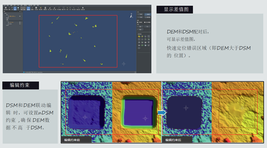 • 编辑过程中,可通过立体窗口严格控制高程,并使用nDSM辅助编辑,确保DSM/DEM逻辑一致性。
